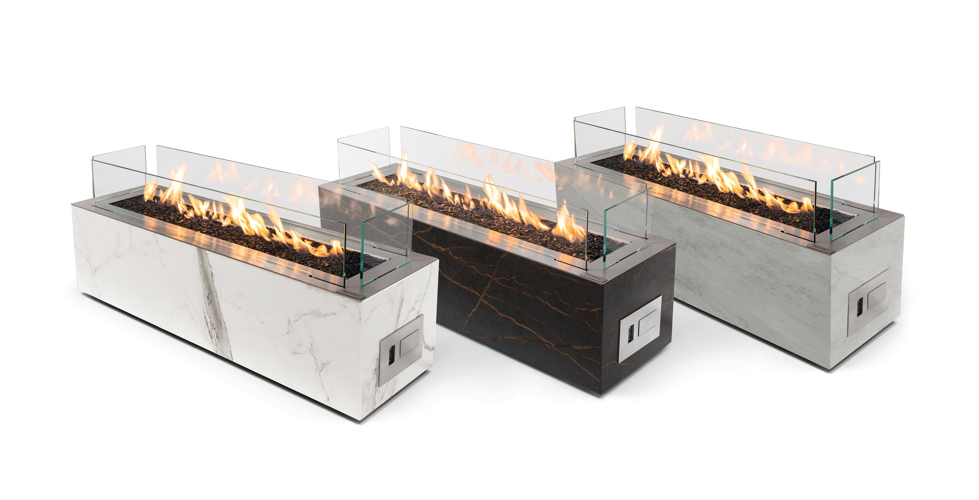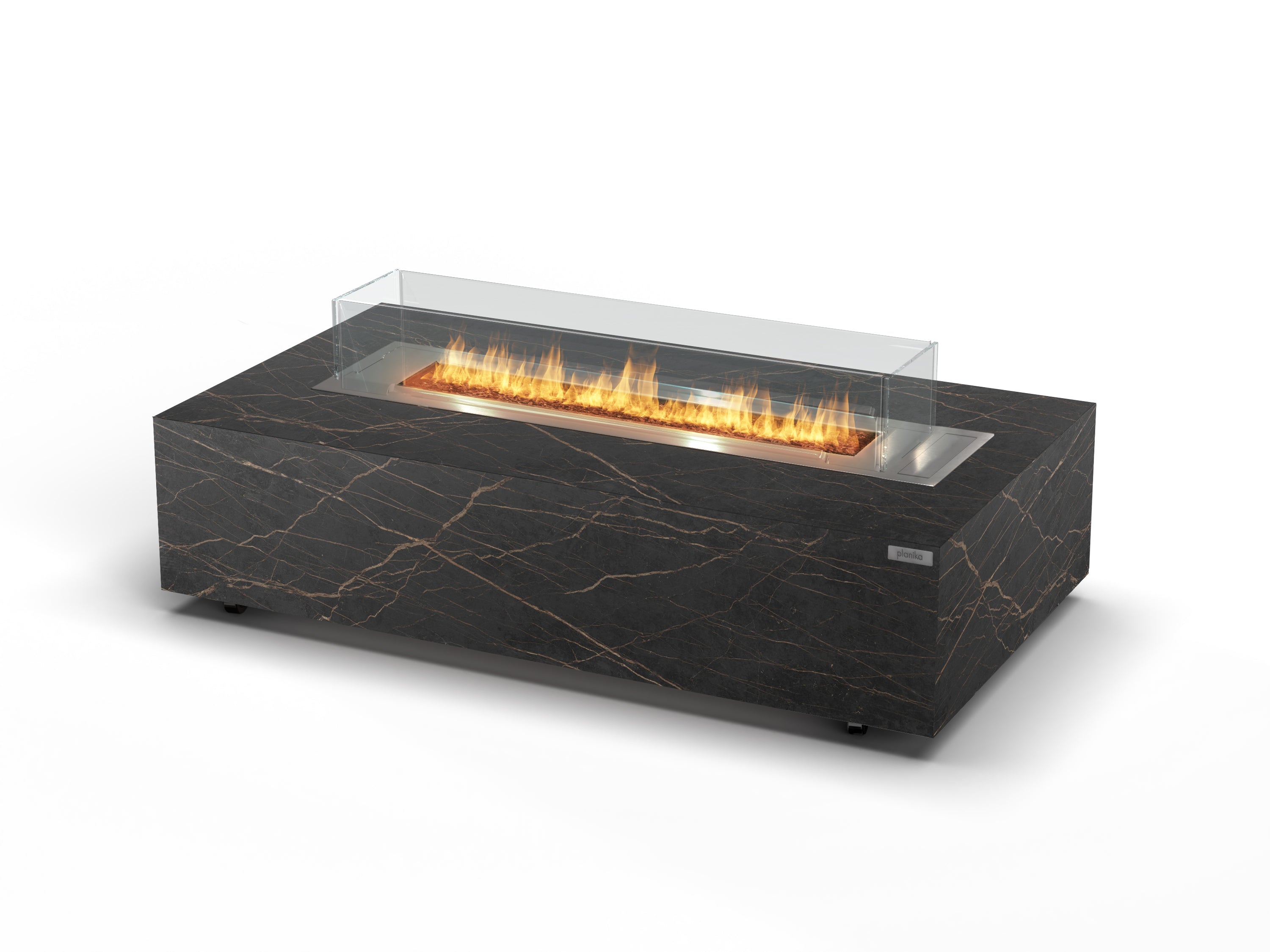 Galaxy is a compact linear firepit enclosed in a minimalist block housing made of Dekton® sintered stone. The stainless-steel burner top features four glass shields for optimal flame stability.